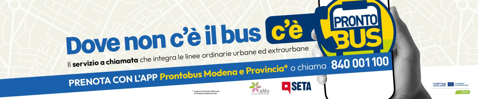 La nuova App è l’azione pilota del Progetto Europeo OPTI UP, di cui aMo è partner. E’ stata sviluppata da VIA, leader mondiale nel settore di tecnologia per il trasporto, ed è disponibile gratuitamente negli store iOS e Android. Attualmente è attiva in forma sperimentale nel Quadrante sud di Modena. Al termine della fase di test, in base ai feedback degli utenti, sarà valutato se confermare ed estendere l’utilizzo dell’App al Quadrante Nord di Modena e gli altri tre Prontobus della provincia (Carpi, Pavullo e Castelfranco) .